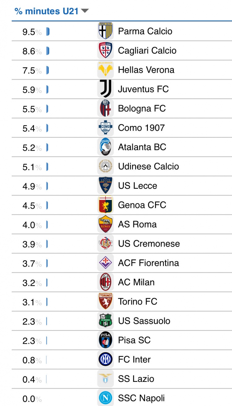 欧洲前10联赛中,只有意甲近5年任何球队U21出场时间均不足10%
